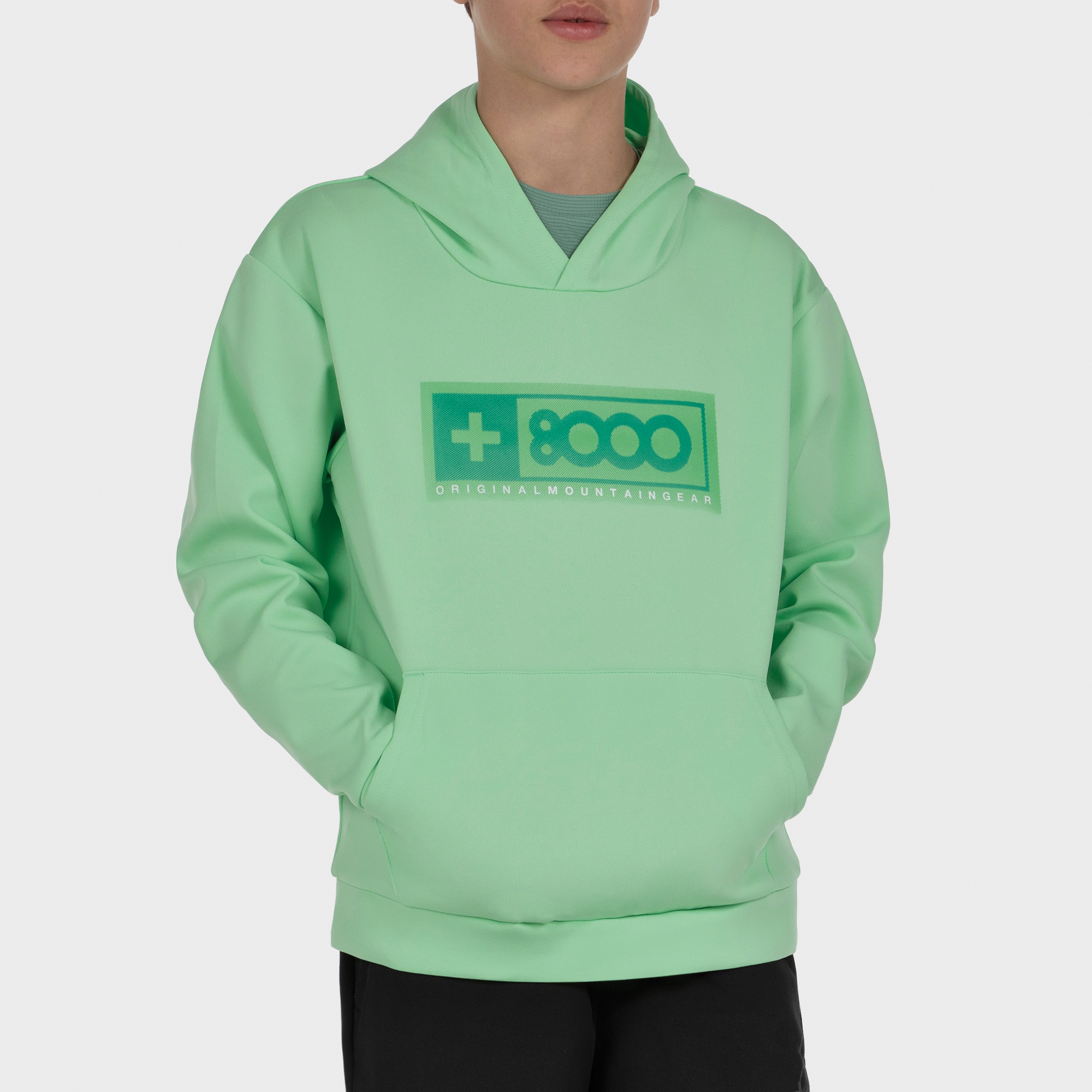 Sudadera con estampado delantero · Tejido principal en interlock poliester muy ligero y capucha en single jersey · Bolsillo delantero tipo canguro · Standard fit.